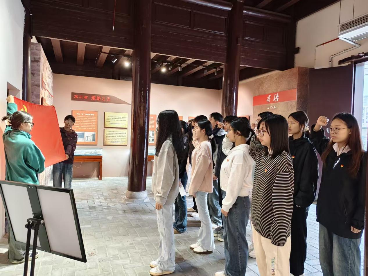 为加强党员理想信念教育,传承红色基因,赓续红色血脉,2025年10月19日上午9时,公共卫生与健康学院(美容医学院)学生党支部组织全体在校党员、新发展党员及入党积极分子代表,赴宜春市袁州会议旧址开展主题党日活动,以实地研学与庄严宣誓相结合的方式,筑牢信仰之基。院党委副书记刘斌出席并指导本次活动。