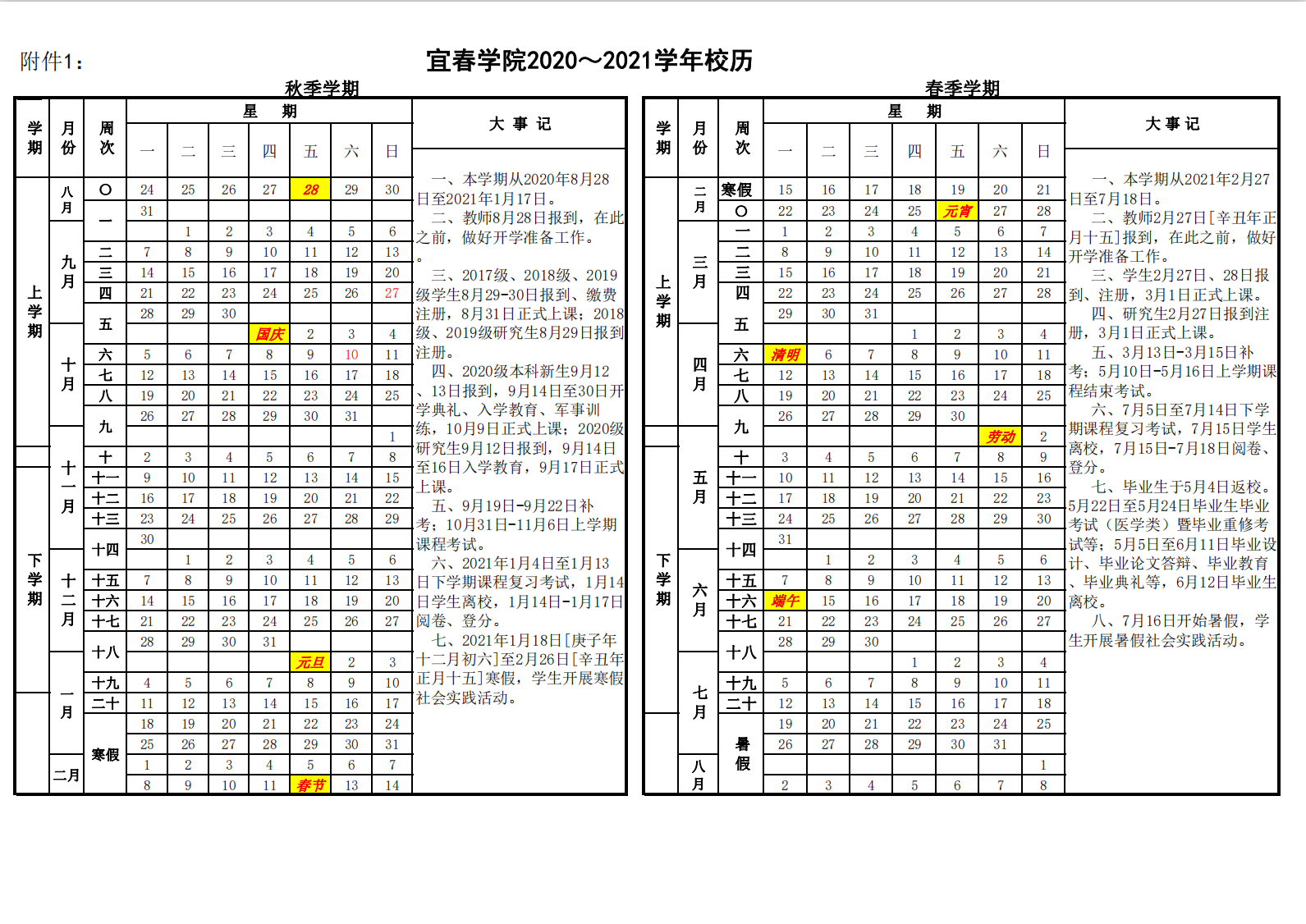 宜春学院2020~2021学年校历安排