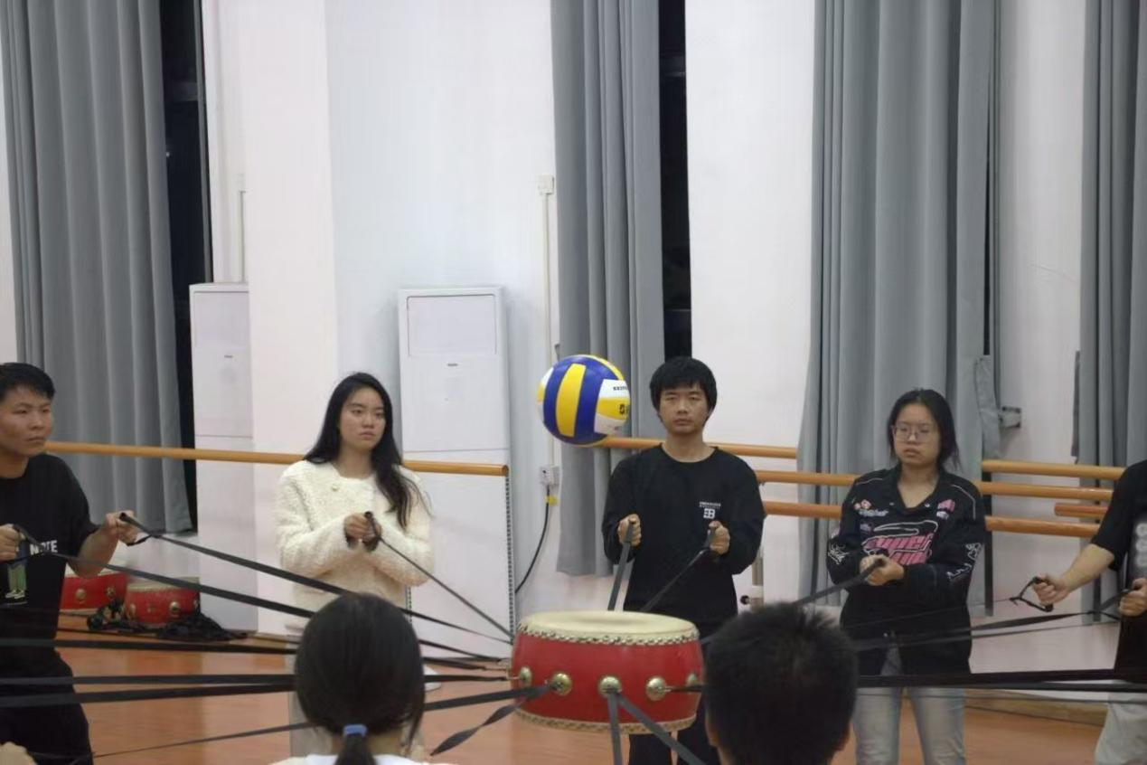 其中,同心鼓项目训练率先掀起热潮,彰显学院备战氛围。体育馆内,学生们围鼓而立,紧握绳索,专注鼓面排球。初时节奏杂乱、用力不均导致排球频落,但无人气馁。大家喊着统一口号校准节奏,前排紧盯落点,后排稳控力度,协作默契持续升温。汗水浸湿衣衫,鼓点愈发整齐,排球接连弹跳,每次成功都伴随欢呼。这场训练凝聚了青春力量,让团结意义深植心底。