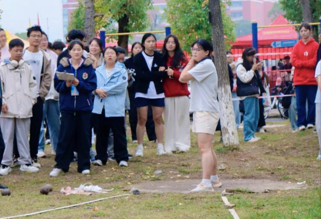 铅球比赛不仅是力量的较量,更是技巧与心态的双重考验。每一次试投都精心酝酿。持球、转身、蓄力、投掷,一系列动作连贯流畅、刚劲有力,铅球在空中划出一道沉稳的抛物线,稳稳落在赛场之上。丁蕊同学在关键轮次中顶住压力,一次次突破自身状态,用扎实的训练功底展现了公卫学子的坚韧风采。