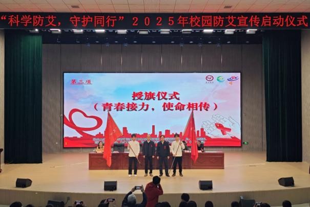 启动仪式上,温城主任发表致辞,从全国及宜春本地疫情态势出发,专业解读了当前艾滋病防治的严峻形势,尤其强调了青年学生群体的防控重点,呼吁青年学子树立“健康第一责任人”意识,争当防艾宣传的主力军。随后,温城主任代表宜春市疾控中心为公共卫生与健康学院(美容医学院)授予“校园防艾教育基地”牌匾,学院党委书记吴雯代表学院揭牌,标志着校地协同防艾教育平台正式落地,开启了“专业赋能、精准施策”的校园防艾新阶段。为强化实践传播力量,刘斌、丁纬分别为两院“红丝带”防艾志愿服务队授旗,志愿者们将肩负使命开展系列防艾宣传活动。仪式现场还为前期防艾宣传创意比赛获奖同学颁奖,表彰他们以海报、视频、文案等创意形式传播防艾知识的积极行动。全体学生高举右拳庄严宣誓,用铿锵誓言表达“科学防艾,从我做起”的坚定决心。最后,吴雯书记作总结讲话,她强调,防艾工作既是守护师生健康的民生工程,更是培养青年责任担当的育人工程,希望全体师生以此次活动为契机,筑牢健康防线,共筑无“艾”校园。