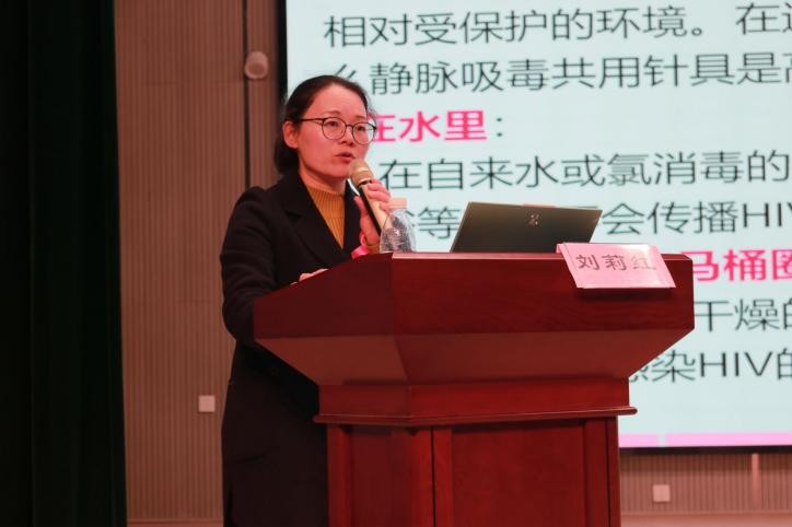 启动仪式后,两场干货满满的专题讲座接续开讲,为师生带来深度知识赋能。首场讲座由宜春市疾病预防控制中心(市卫监局)刘莉红科长主讲,主题为《社会共治 守正创新 终结艾滋——科学防艾 守护同行》。刘科长深耕防艾一线多年,结合全国及宜春本地疫情数据,从艾滋病基本概念、传播途径、核心危害入手,重点解析了青年学生群体的感染特点与风险隐患,破除了“日常接触会感染”等认知误区。她还为师生详解了72小时暴露后阻断的“黄金时间”、国家“四免一关怀”政策及江西省“三免一补助”服务,明确了宜春市区本地求助渠道,以实用干货为师生织密健康防护网。
