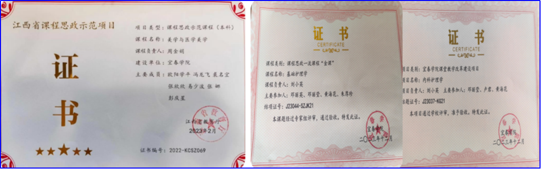 1.坚守课堂育人主渠道,深挖课程思政内涵。学院将职业伦理与“健康中国”战略融入教学,打造医学特色思政品牌。《医学美学》获批国家级一流本科课程,《美学与医学美学》获评省级课程思政示范课程,其教学团队荣获省本科高校教师教学创新大赛二等奖2次。《内科护理学》《基础护理学》等多门课程获评校级金课,形成了国家、省、校三级一流课程思政体系。
