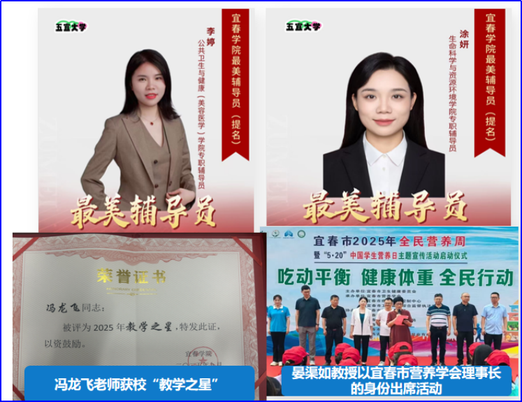 2.筑牢师德师风关键环,打造高尚教师队伍。 学院坚守师德“生命线”,建立师德档案,严抓考核标准。近三年实现师德失范“零案例”,涌现出江西省金牌研究生导师吴正平教授、首届江西省本科高校金牌青年教师周金娟、校“最美辅导-员”涂妍李婷、“最受欢迎教师”刘小英、教学之星冯龙飞等一批先进典型。预防医学专业晏渠如教授,以宜春市营养学会理事长身份带领师生深耕营养科普,成为师德建设与社会服务深度融合的典范。